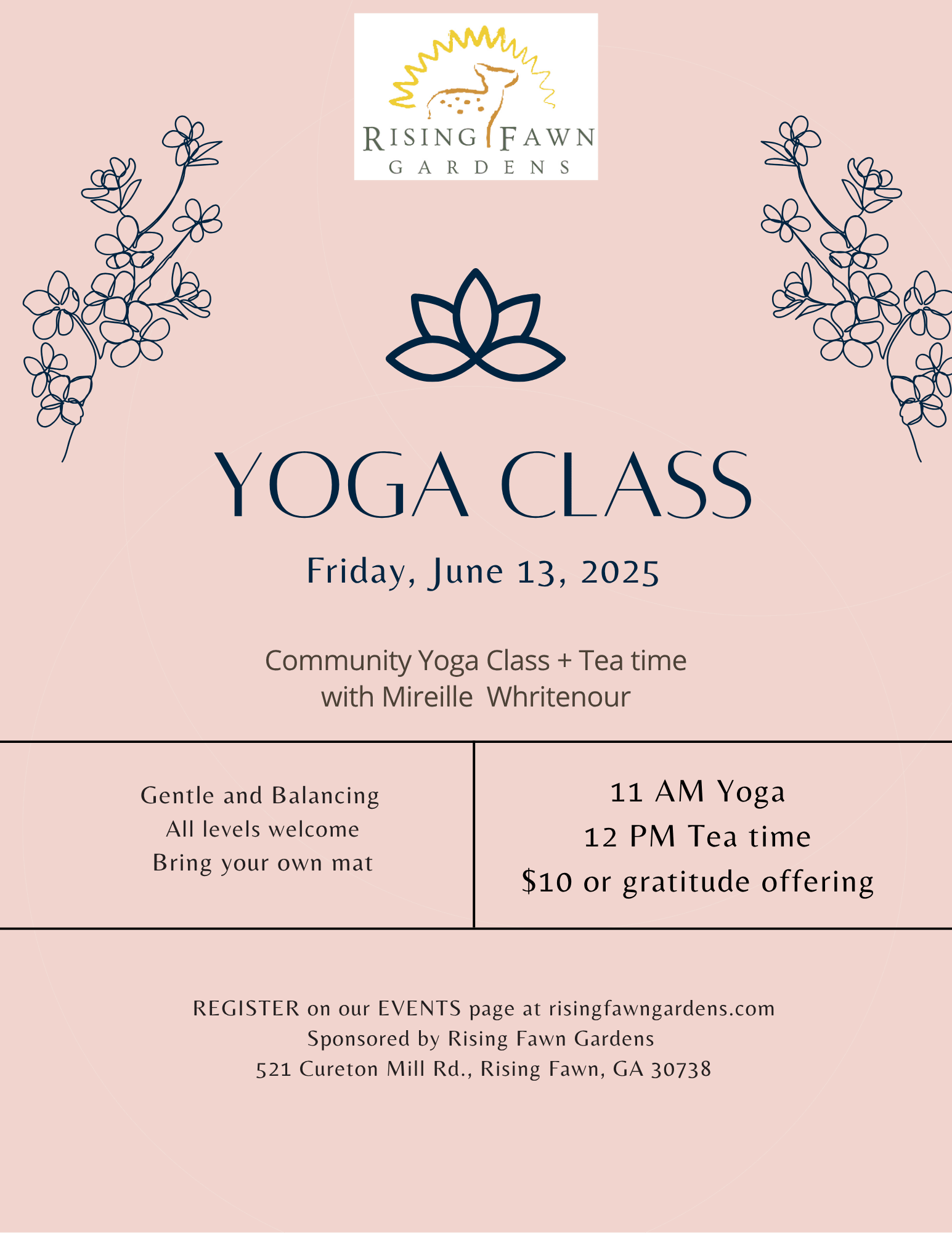 🌐 Register on the Events page at https://www.risingfawngardens.com/events/community-yoga-class-with-mireille-whritenour/