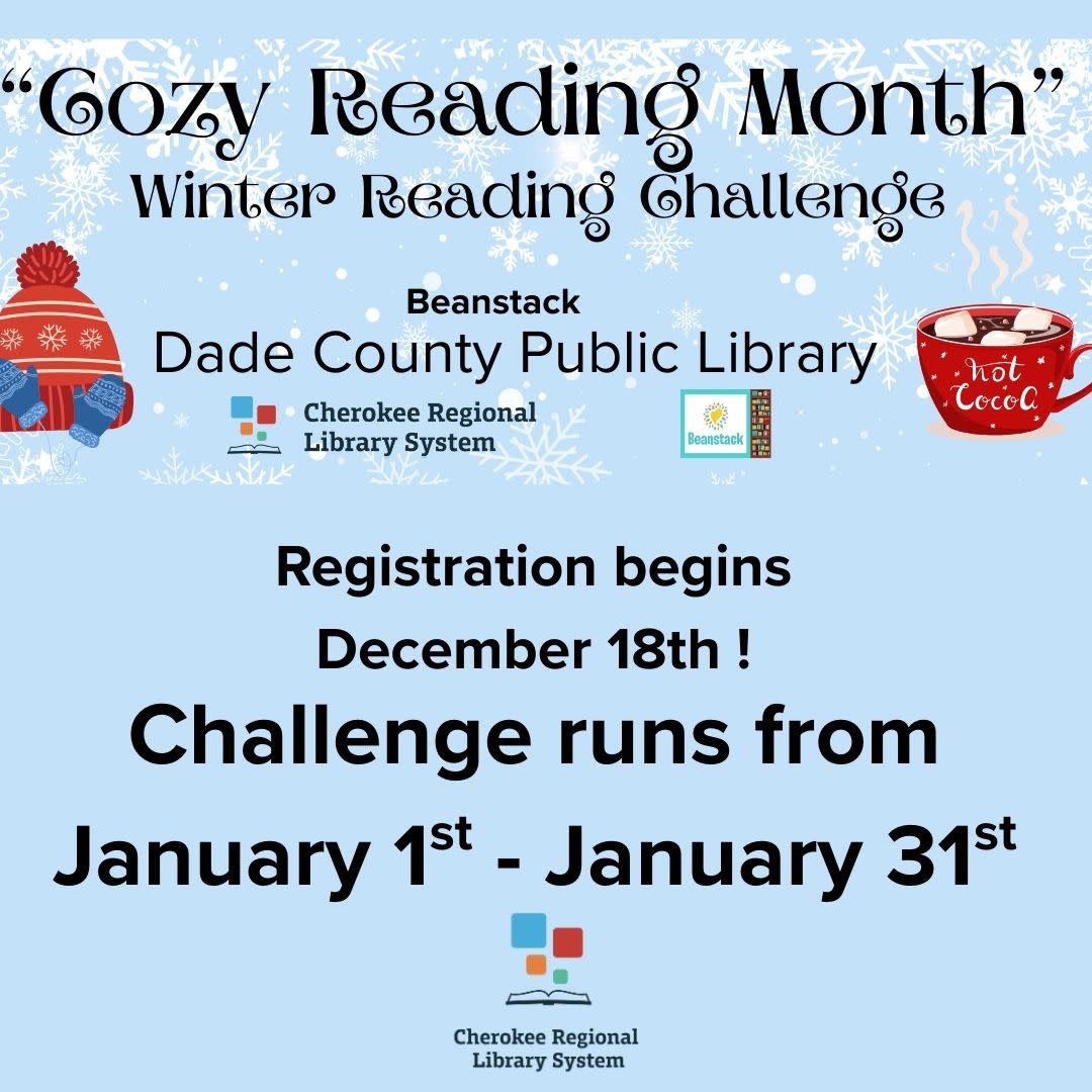 Snuggle up with a good book and join the Cozy Reading Month Winter Reading Challenge at Dade County Public Library! Track your reading on Beanstack and make reading part of your winter routine. Registration opens December 18, and the challenge runs January 1–31.
