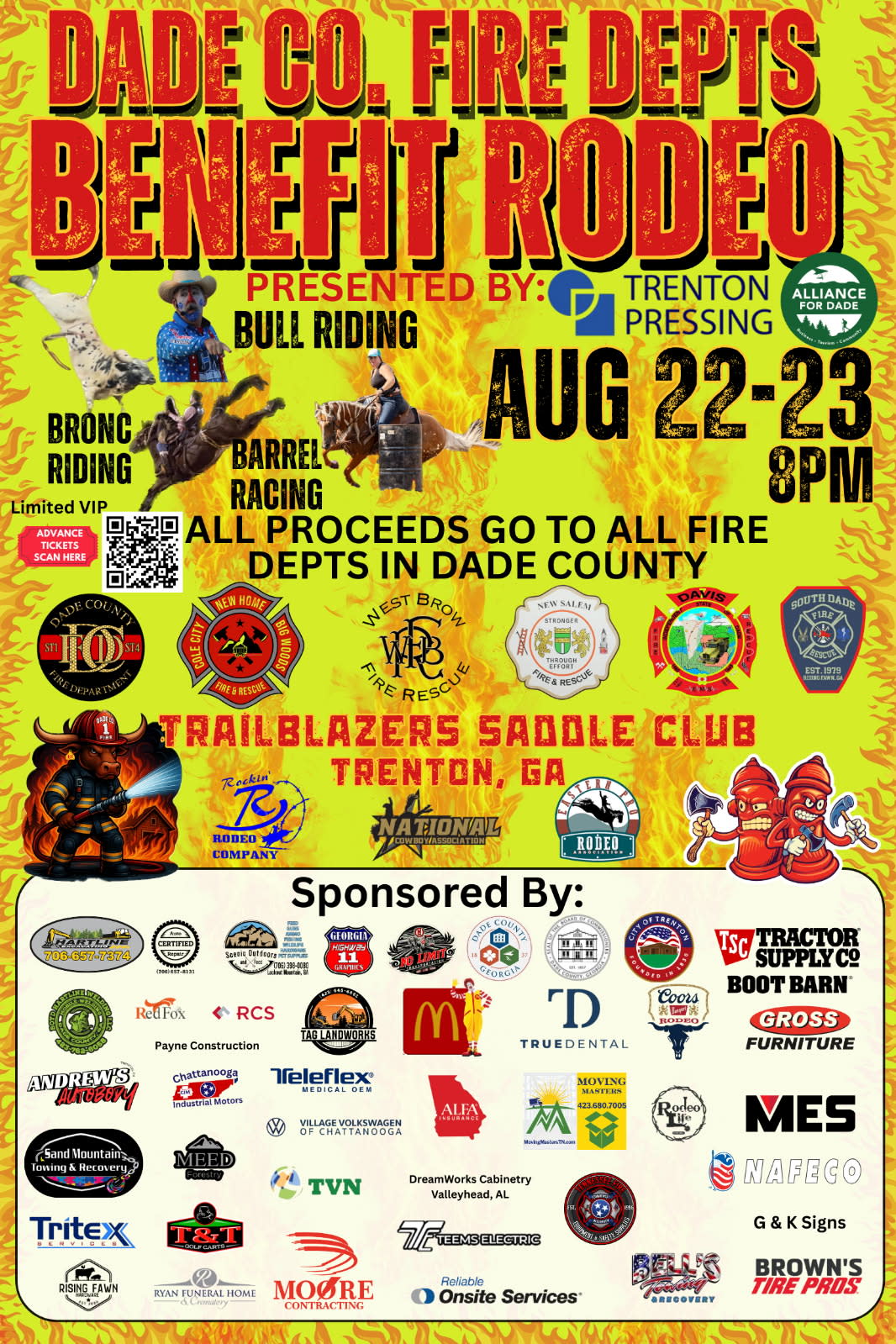 Join us for the Dade County Fire Departments Benefit Rodeo on August 22–23 at 8 PM at the Trailblazer Saddle Club in Trenton, GA!