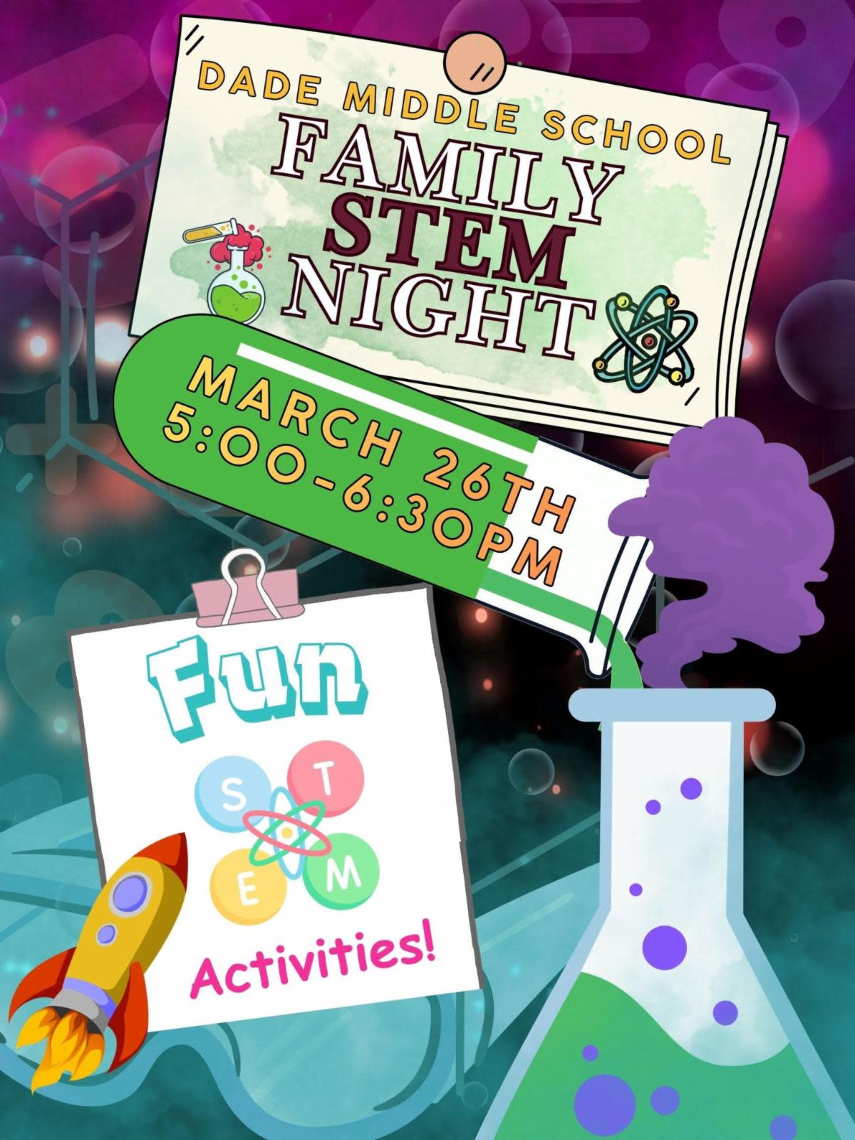 Join Dade Middle School for an exciting Family STEM Night filled with hands-on learning and fun! Families are invited to explore interactive activities focused on Science, Technology, Engineering, and Math (STEM).