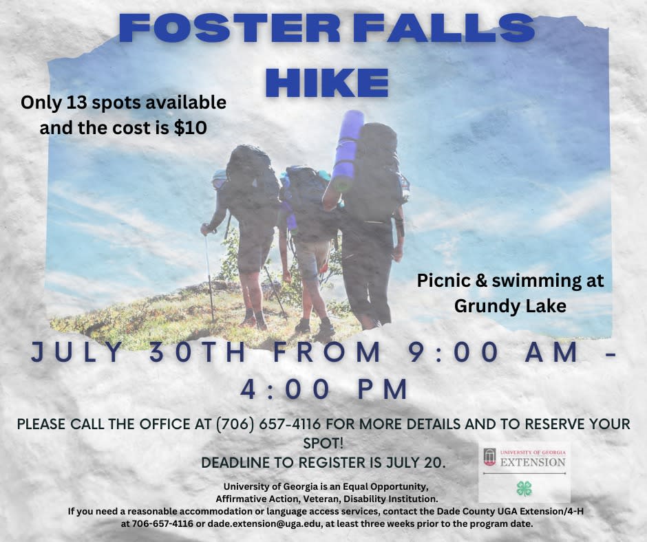 Join us for a fun and scenic hike to Foster Falls on July 30th from 9:00 AM to 4:00 PM. Participants will enjoy a guided hike followed by a picnic and swimming at Grundy Lakes. The trip costs $10, and only 13 spots are available, so be sure to reserve early. To sign up or learn more, call (706) 657-4116. Registration deadline: July 20.