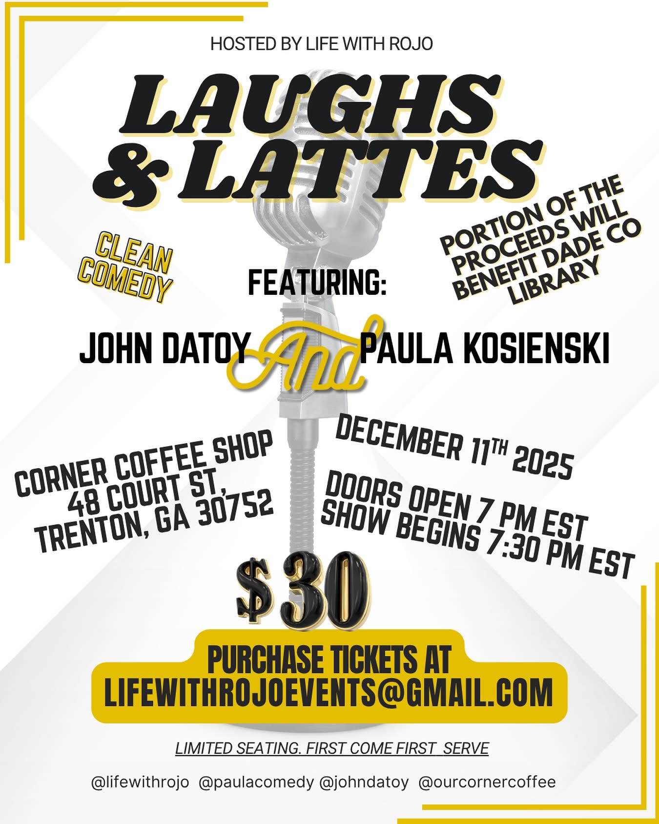 Enjoy an evening of laughter, lattes, and community at Laughs & Lattes, a clean comedy show featuring John Datoy and Paula Kosienski. This fun-filled night is perfect for all ages and supports a great cause — a portion of proceeds will benefit the Dade County Library.