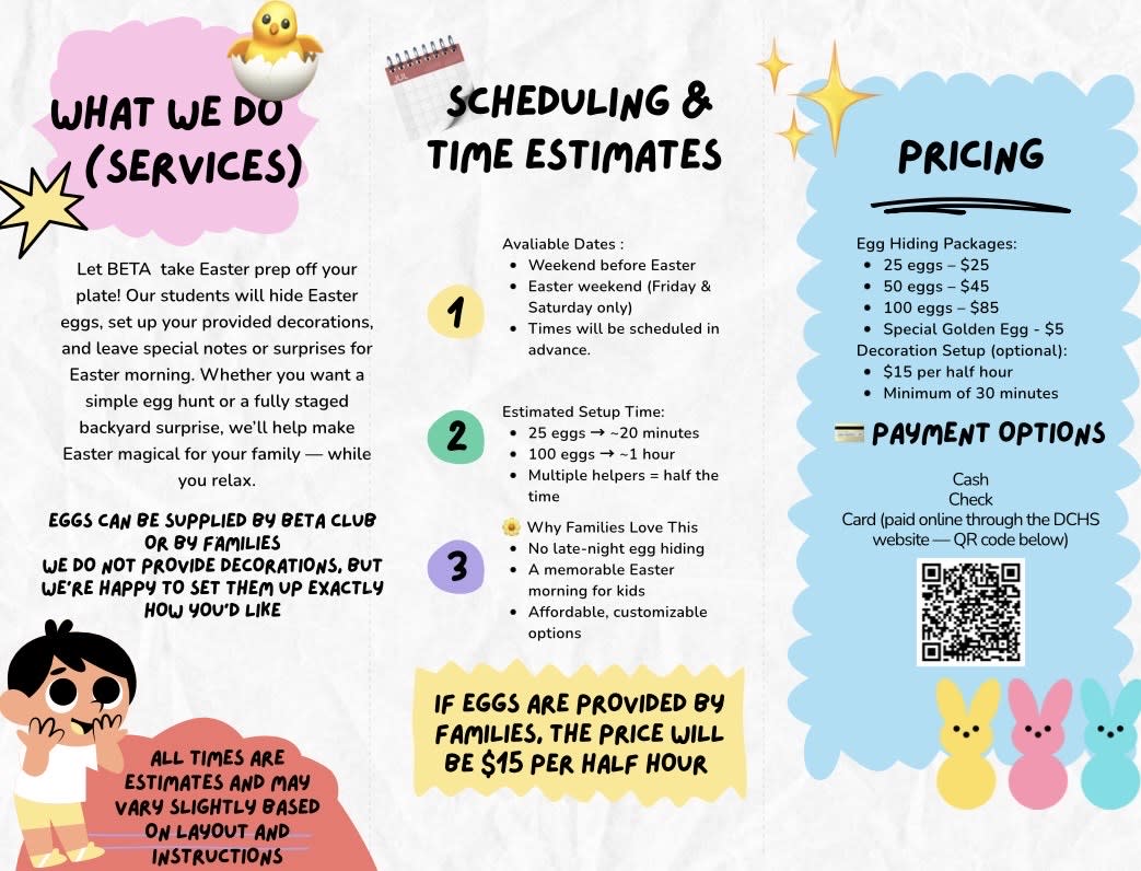 Let BETA Club students take Easter prep off your plate! We’ll hide eggs, set up your provided decorations, and create a magical Easter morning surprise for your family. Available the weekend before Easter and Easter weekend (Friday & Saturday only).