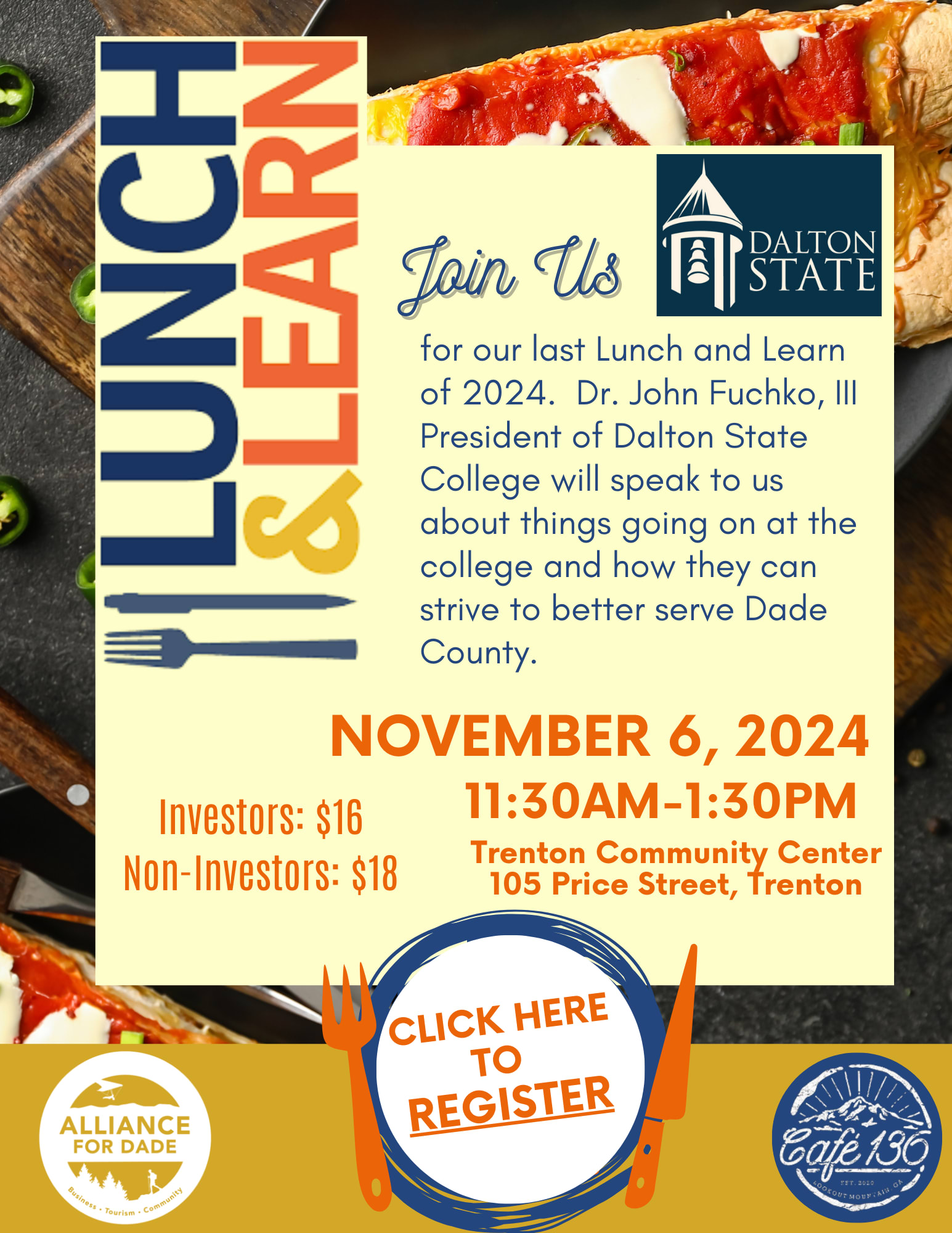 Dr. John Fuchko, III President of Dalton State College will speak to us about things going on at the college and how they can strive to better serve Dade County.Images